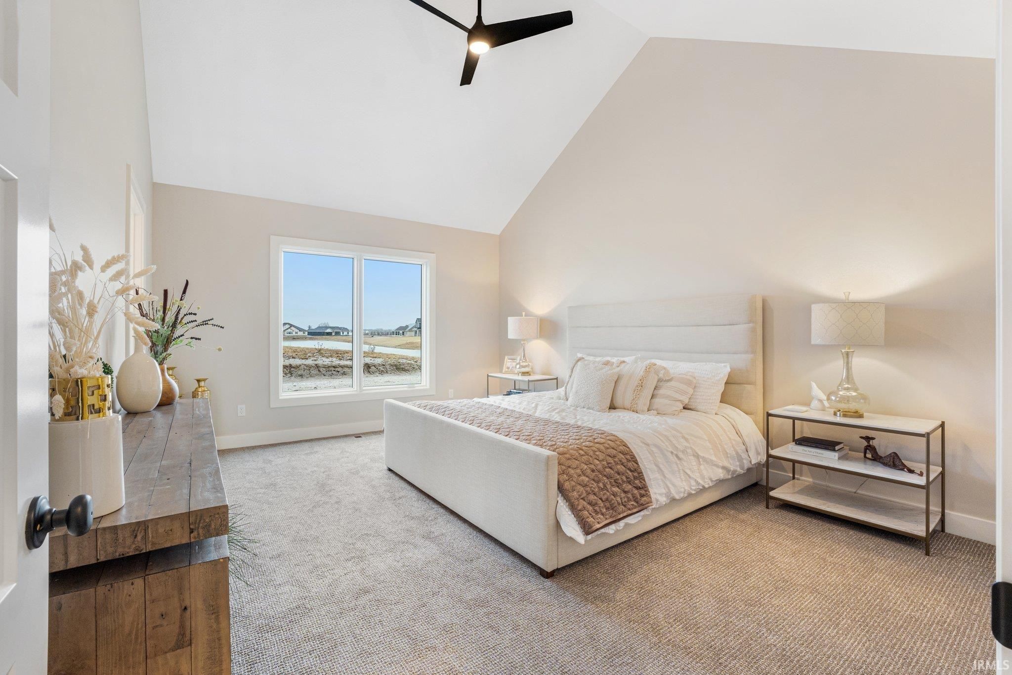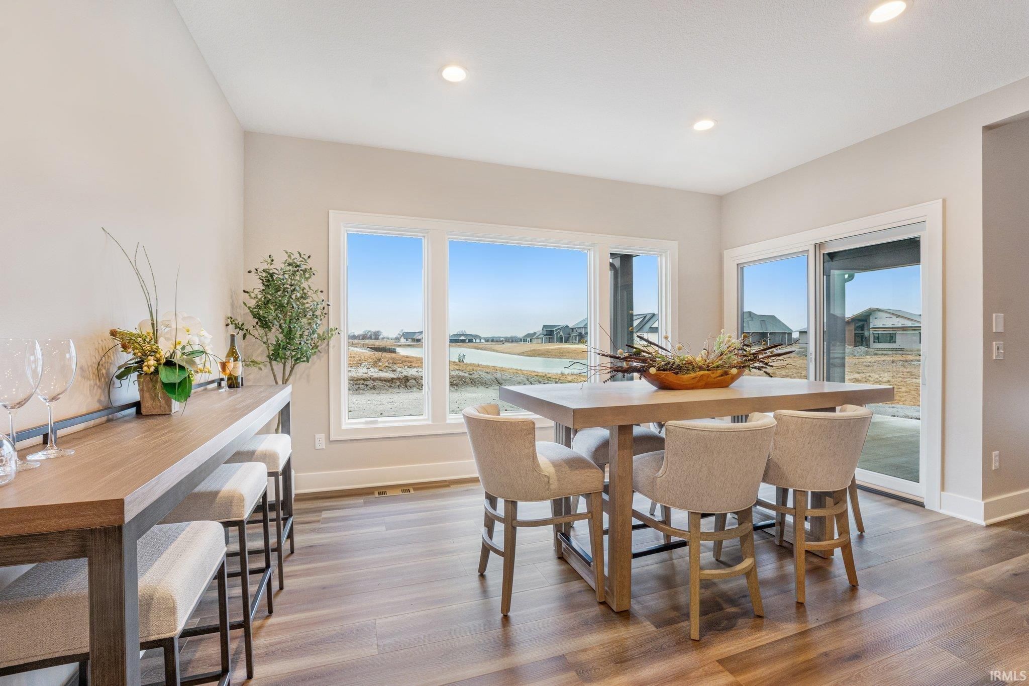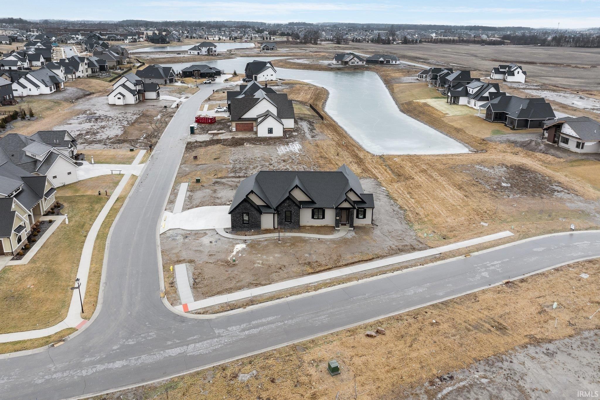 Corner Lot with Water Views | Bob Buescher Homes | Brand New | Warranties Begin at Closing. Experience the opportunity to own a completed custom home in Mercato by one of Fort Wayne’s most recognized builders. Built in 2024, this Bob Buescher Home includes builder warranties beginning at closing, offering peace of mind to its new owner. Positioned on a desirable corner lot with water views, this thoughtfully designed ranch offers 2,156 square feet of living space with three bedrooms, 2.5 baths, a den, and a 778 square foot side-load three-car garage. The open-concept layout is centered around a dramatic great room featuring a soaring cathedral ceiling and fireplace that creates both warmth and architectural presence. Expansive windows allow natural light to fill the space while connecting the interior to the surrounding views. The kitchen showcases the craftsmanship Bob Buescher Homes is known for, featuring custom white oak and elm cabinetry, a large 5x8 quartz island with MSI Midnight Carbo countertops, a gas range, and a spacious 7-foot-deep walk-in pantry. The dining area flows seamlessly into the great room, making the home ideal for both everyday living and entertaining. The primary suite is privately positioned and features a cathedral ceiling, spa-inspired bathroom with double vanity, custom tile walk-in shower, private water closet, linen closet, and an impressive 17-foot-deep walk-in closet. Two additional bedrooms provide comfortable space for family or guests, while the den near the foyer offers flexibility for a home office or quiet retreat. Outdoor living extends to a covered rear porch with an additional patio area, creating an ideal space to relax or entertain while enjoying the surrounding water views. Luxury vinyl plank flooring runs throughout the main living areas with carpet in the bedrooms. Located in the desirable Mercato community with convenient access to I-69, Lutheran Hospital, shopping, and dining, this home offers the quality and design of custom construction without the extended build timeline. Immediate possession available upon closing. This completed ranch is move-in ready and waiting for its first homeowner.