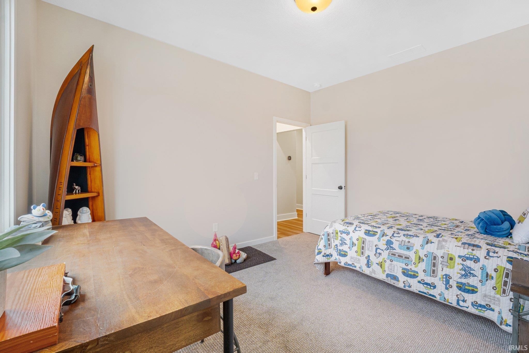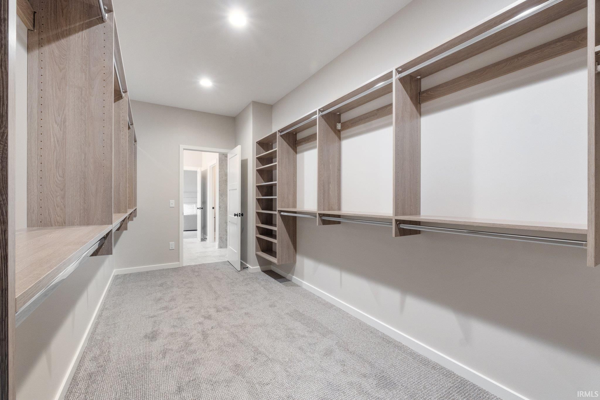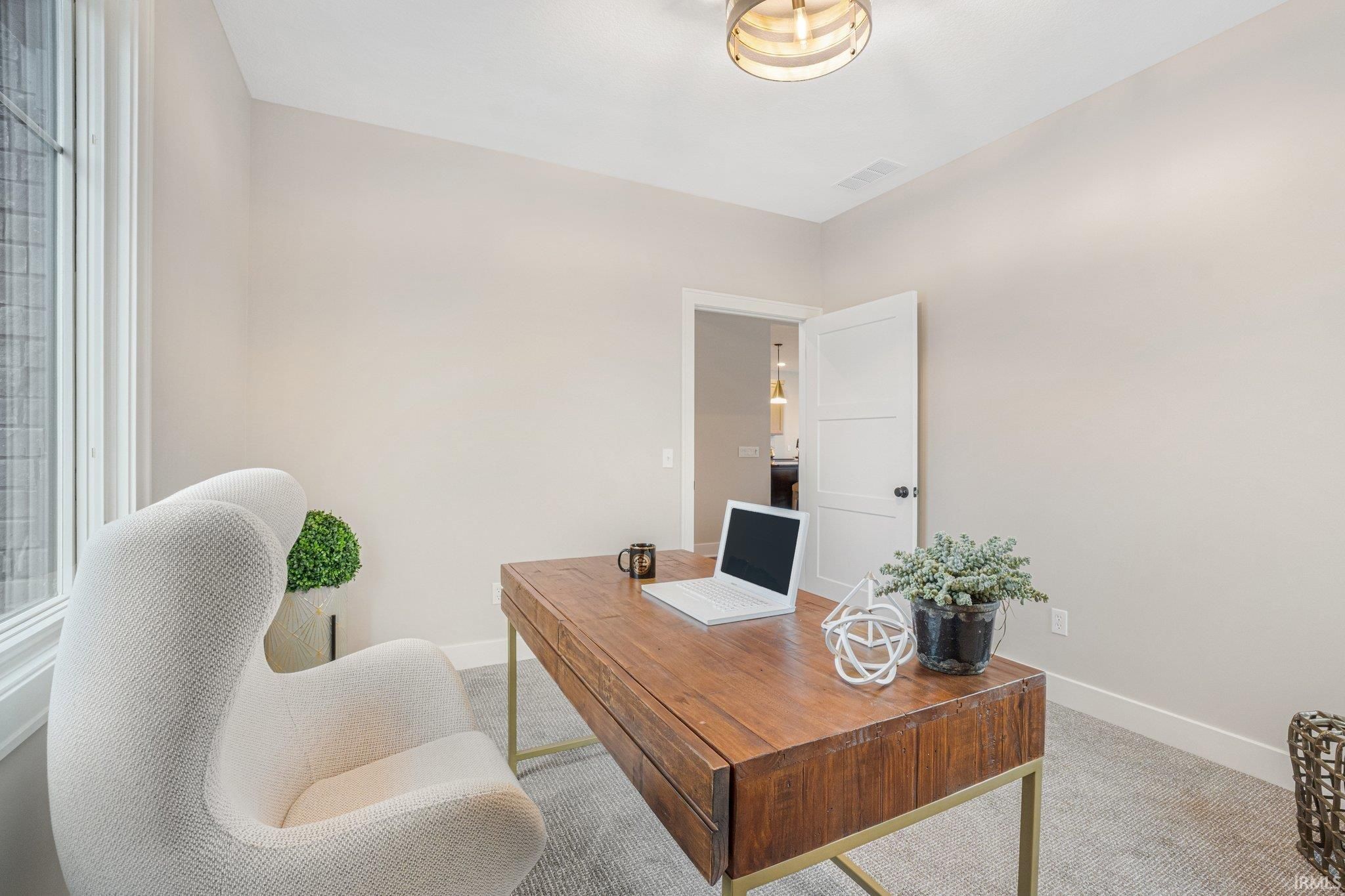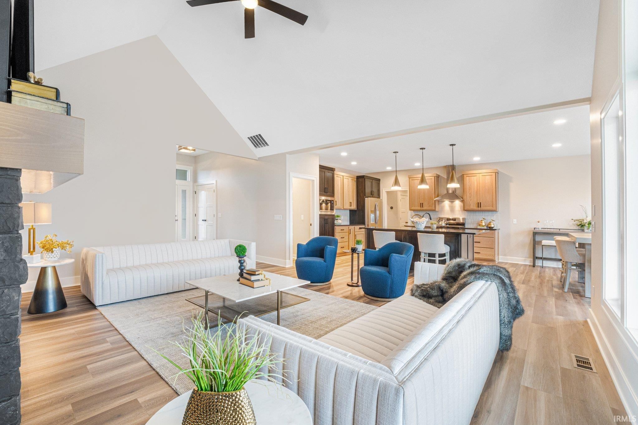 Corner Lot with Water Views | Bob Buescher Homes | Brand New | Warranties Begin at Closing. Experience the opportunity to own a completed custom home in Mercato by one of Fort Wayne’s most recognized builders. Built in 2024, this Bob Buescher Home includes builder warranties beginning at closing, offering peace of mind to its new owner. Positioned on a desirable corner lot with water views, this thoughtfully designed ranch offers 2,156 square feet of living space with three bedrooms, 2.5 baths, a den, and a 778 square foot side-load three-car garage. The open-concept layout is centered around a dramatic great room featuring a soaring cathedral ceiling and fireplace that creates both warmth and architectural presence. Expansive windows allow natural light to fill the space while connecting the interior to the surrounding views. The kitchen showcases the craftsmanship Bob Buescher Homes is known for, featuring custom white oak and elm cabinetry, a large 5x8 quartz island with MSI Midnight Carbo countertops, a gas range, and a spacious 7-foot-deep walk-in pantry. The dining area flows seamlessly into the great room, making the home ideal for both everyday living and entertaining. The primary suite is privately positioned and features a cathedral ceiling, spa-inspired bathroom with double vanity, custom tile walk-in shower, private water closet, linen closet, and an impressive 17-foot-deep walk-in closet. Two additional bedrooms provide comfortable space for family or guests, while the den near the foyer offers flexibility for a home office or quiet retreat. Outdoor living extends to a covered rear porch with an additional patio area, creating an ideal space to relax or entertain while enjoying the surrounding water views. Luxury vinyl plank flooring runs throughout the main living areas with carpet in the bedrooms. Located in the desirable Mercato community with convenient access to I-69, Lutheran Hospital, shopping, and dining, this home offers the quality and design of custom construction without the extended build timeline. Immediate possession available upon closing. This completed ranch is move-in ready and waiting for its first homeowner.