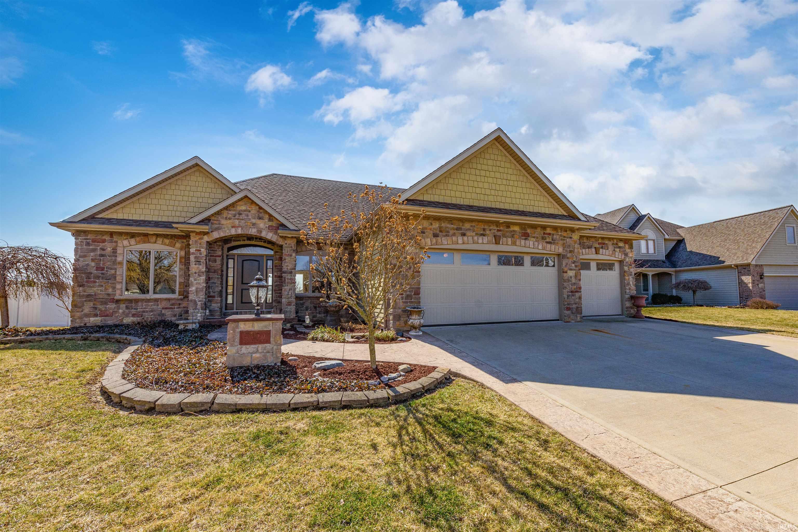 Totally Custom-built, 4 Bedroom, 4060 total sq. ft. cream puff located in Sorrento. NW Fort Wayne - Carroll Schools. Featuring over 2000 sq. ft. on the main level, PLUS a FULL BASEMENT with another 2000 sq. ft. complete with a Theatre Room, Wet Bar, Full Bathroom! Beautiful stone front with stamped concrete driveway borders & sidewalk. Open Foyer with ceramic walkway that leads back to the Kitchen which has GRANITE countertops & a walk-in pantry. COFFERED CEILING in the Great Room & a vaulted ceiling in the Hearth Room with a wall of windows overlooking the backyard. Master Suite has a tray ceiling with accent light, double vanity, heated ceramic floors, huge vaulted walk-in with closet tamers & a custom ceramic shower! Spacious bedroom sizes with 3 FULL BATHS to boot! Basement has huge daylight windows w/ a Rec Room area, pool table area, plus another game area, Movie theater w/ 92" screen, Bedroom, Wet Bar and Full Bath. TREX DECK leads to a stamped concrete patio featuring a sunken bonfire pit. The 3 car garage also features a custom bulit-in work shop. All new paint and carpets. New water heater (2022), new oven/microwave (2022), new sump pump (2022), and new garbage disposal (2023). This home is move-in ready! Built in 2011 by J&K Homes. One Owner.