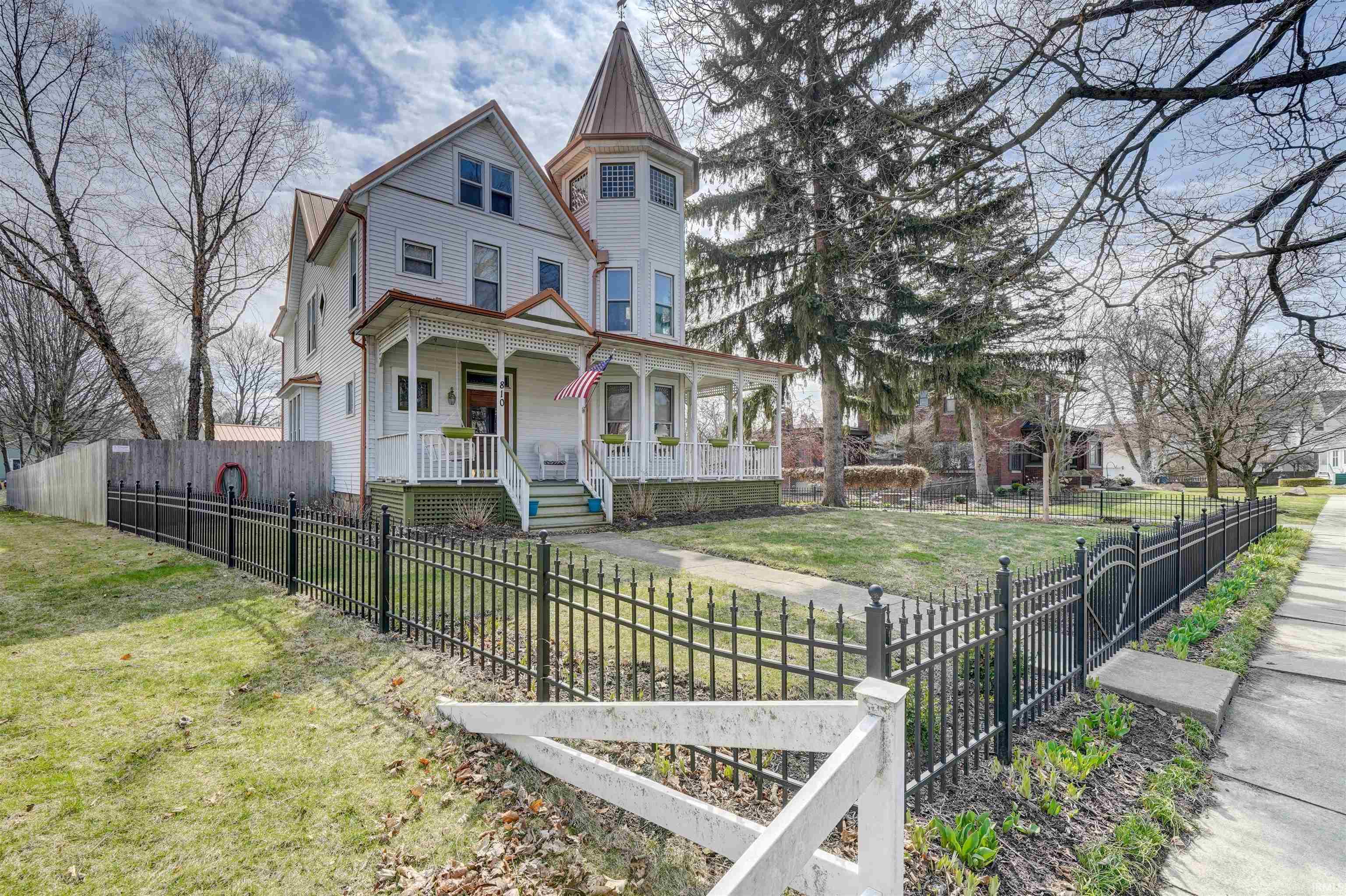 *Charming, historic Queen Anne style home with wrap-around porch and turret on N Main St in Auburn! Filled with character such as beautiful, ornate staircase, original hardwood floors throughout almost all of house, transoms, 4 sets of sliding pocket doors, and much more! Beautiful entry, parlor with fireplace surround with original small tiles, bronze working heat panel, and framed mirror (mirror is stored); great view with bay windows on 3 levels! The parlor opens to a large room for family and dining area. Updated kitchen with island and refurbished soda fountain seats. Extra room off kitchen and mud room provides extra storage. Main level has 1 1/2 baths. Characteristic of the time when the house was built, a second staircase with narrow steps from the main level leads to the basement, 2nd floor, and HUGE attic space with turret. 4 bedrooms on the second floor and one smaller room (maybe a nursery, small office or craft room?) all have transoms above the doors. 2nd full bathroom with jetted tub was remodeled 2020. Extras: swimming pool 30'X16'; 3 car garage 31'X24'; asphalt drive (access from either street). Updated wiring, new steel roof 2018 (50 yr); new gas furnace and AC 2021; new water heater and water softener 2022. Beautiful historical home, great location and price!