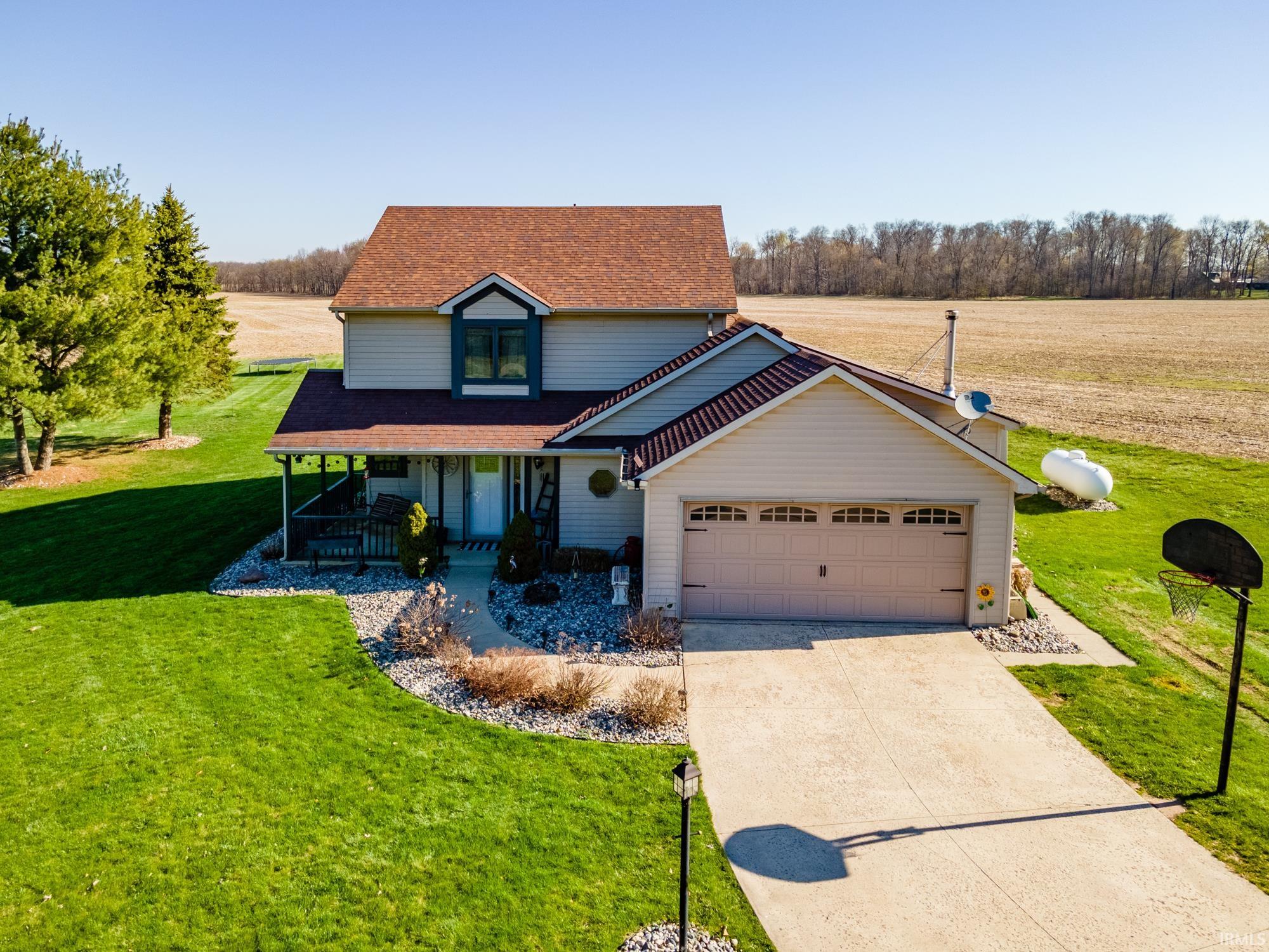 DO NOT miss out on this amazing rural home situated on almost 2 acres! This 3 bedroom, 2.5 bath home features an open floor plan with main level laundry, 2 separate living areas, vaulted ceiling in the living room with a cozy wood burning stove, a dedicated dining area, updated kitchen with granite countertops and breakfast bar, porcelain tile in the kitchen and entryway, owner's suite with ensuite and walk-in closet, granite countertops in all bathrooms, and a partially finished basement! Recent updates include paint on the front patio, main level bathroom, kitchen, all bedrooms, ensuite, and walk-in closet, mulch was removed and replaced with stone, new light fixture in the ensuite, and the walk-in closet was also completely remodeled. In addition, the garage door springs and battery for back up sump pump were replaced in 2022, new wood stove, new garage door, new front door in 2015, and furnace was replaced in 2012. Come enjoy the view from the porch swing on the covered front porch or relax in the pool. The back deck is also perfect for grilling/entertaining! This property is rounded out by the attached 2 car garage, shed, and playset!