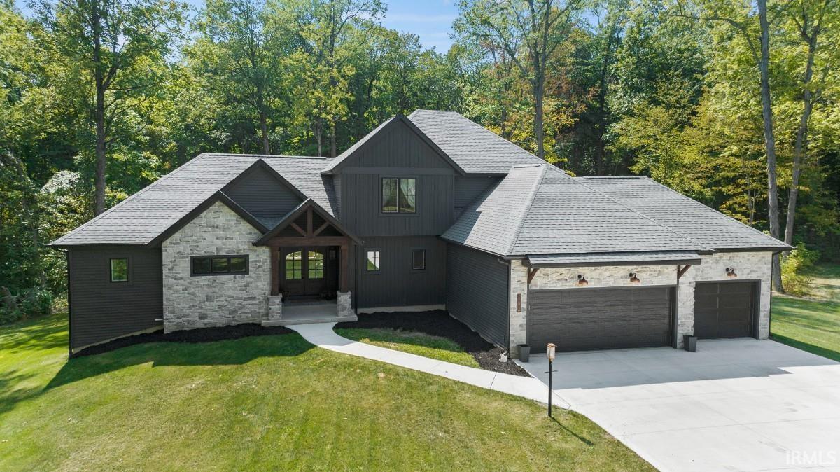 One of a kind custom designed luxury home on a 1.31-acre wooded cul de sac lot. An open floor plan with 14’ beamed cathedral ceiling, stone fireplace and incredible views from the wall of windows is ideal for entertaining. The stunning kitchen includes custom cabinets, a 9 x 5 quartz island, a dual fuel range, additional wall oven and microwave, refrigerator, and dishwasher. An oversized walk-in pantry provides plenty of storage and a second work sink. The main floor also includes a powder room, laundry, and office. The incredible first floor owner’s suite has back deck access, an oversized tiled walk-in shower, soaking tub and large vanity with a trough sink, and a 10’5”x13’2” custom closet. The second floor includes a guest suite with walk-in closet and tiled bathroom, a large linen closet, two additional large bedrooms with a jack-and-jill bath. Upgraded flooring and lighting throughout this beautiful home. A large, framed and plumbed basement provides plenty of storage space, along with endless opportunities to add a game room, additional bedroom, workout room or theater. The exterior of this includes a gorgeous combination of charcoal siding and board and batten, stone, and cedar. A large, elevated deck allows for outdoor entertaining with a view of the huge, wooded backyard. Great location in a growing Fort Wayne suburb! The Honeysuckle neighborhood offers executive homes on large lots and is in the coveted East Allen School District.